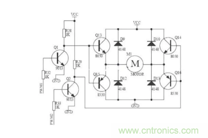 驅動電機時,保證H橋上兩個同側的三極管不會同時導通十分重要。假如三極管Q1和Q2同時導通,那么電流就會從正極穿過兩個三極管直接回到負極。此時,電路中除了三極管外沒有其他任何負載,因而電路上的電流就可能到達最大值(該電流僅受電源性能限制),以至燒壞三極管?;谏鲜鼍売?,在實踐驅動電路中通常要用硬件電路便當?shù)乜刂迫龢O管的開關。