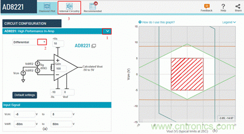 如圖3.7為ADI公司精密信號在線設(shè)計工具界面,選擇“IN AMP”,進入儀表放大器配置窗口,如圖3.8(a)。通過選項1選擇需要評估的器件AD8221,然后在選項2配置為差分輸入架構(gòu),接下來配置供電電壓±Vs為±10V,參考電壓源VREF為0V,增益Gain為100,輸入共模電壓Vcm為±5V,輸入差模電壓Vdiff為±50mV,該電路配置狀態(tài)下的鉆石圖如圖3.8(b),在25℃條件下,輸出電壓Vout與輸入共模電壓Vcm形成的區(qū)域(紅色陰影區(qū))沒有受到限制,電路正常工作。