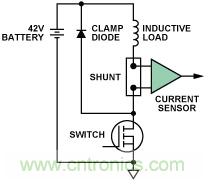 在很多功率電子系統(tǒng)中,需要對于電源正極輸出電流進(jìn)行檢測(也稱高端電流檢測:High-Side Current Sensing),比如電機(jī)控制、線圈驅(qū)動、電源管理(像 DC-DC轉(zhuǎn)換,電池檢測等)。在這些應(yīng)用中,在電源的正極(高端)而非負(fù)極(也就是電流返回端)對電流檢測,可以提高電流檢測性能。例如可以確定對地短路電流、檢測續(xù)流二極管中的電流。如果在電源負(fù)端使用分流器來獲取電源電流可能會造成地線電位的不一致。下面圖1, 圖2 顯示了使用高端檢測電機(jī)和電磁線圈電流的電路配置。