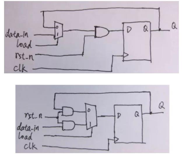 這兩個(gè)電路的功能完全一樣,只不過(guò)右邊電路的復(fù)位控制邏輯(即復(fù)位與門(mén))在多路復(fù)用器之外,也就是遠(yuǎn)離了觸發(fā)器。