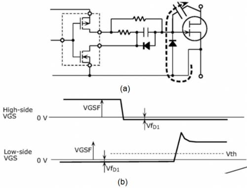 而電容上所并聯(lián)的二極管(26,36)則是為了應對如下圖4中所示的情況,當下半橋處于關斷,上半橋從關斷變?yōu)閷〞r,上半橋?qū)⒏唠妷杭虞d到下半橋晶體管的漏極,通過柵極-漏極間的寄生電容進行放電,可能造成下半橋晶體管的Vgs正向偏置并大于閾值電壓,出現(xiàn)誤導通的問題。通過電容上所并聯(lián)的二極管則可以將上述正向偏置電壓鉗位在VfD2的電平。