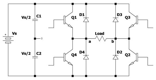 單相全橋電壓發(fā)生器逆變器由四個(gè)斬波電路組成,如圖 2 所示。其中有四個(gè)晶體管或 MOSFET(Q1、Q2、Q3 和 Q4)。它們可以單獨(dú)和獨(dú)立地驅(qū)動(dòng),因此終的操作會(huì)根據(jù)順序以及電子開(kāi)關(guān)的打開(kāi)和關(guān)閉方式而有所不同。由于其電子元件形成的奇特圖形形狀,該設(shè)備也被稱(chēng)為“H 橋”。終結(jié)果是使用相同電源電壓的兩個(gè)單相、兩電平逆變器的組合。我們將在下面檢查不同的激活序列: