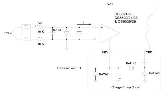 CS5521/23、CS5522/24/28 和 CS5525/26 系列 A/D 轉(zhuǎn)換器包含斬波穩(wěn)定儀表放大器,用于測量低電平直流信號(±100 mV 或更小)。該放大器設(shè)計用于產(chǎn)生非常低的輸入采樣電流(在 -40 至 +85?C 范圍內(nèi),ICVF < 300 pA)。當(dāng)使用高阻抗電路進行輸入保護時,低輸入電流可限度地減少熱電偶測量中可能出現(xiàn)的誤差,如圖 1 所示。