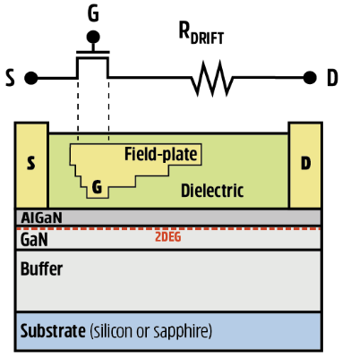 圖1展示了一個(gè)橫向 (lateral) 氮化鎵功率晶體管的原型結(jié)構(gòu)—這幾乎是當(dāng)今市面上所有氮化鎵器件的結(jié)構(gòu)。AlGaN/GaN層通過沉積在被精心設(shè)計(jì)的緩沖層隔開的硅襯底上以實(shí)現(xiàn)高材料質(zhì)量及阻斷電壓。溝道與漏極 (Drain) 及源極 (Source) 接觸從而使電流通過。而調(diào)制電流的柵極 (Gate) 位于漏源之間并通過電介質(zhì)層隔離來取得低漏電與高穩(wěn)固性。場板 (Field-plate) 結(jié)構(gòu)被設(shè)計(jì)用來取得最佳的電場散布及高可靠性。