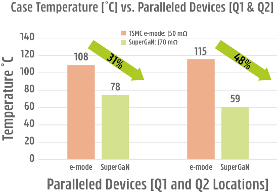 這些優(yōu)勢得到了實(shí)際應(yīng)用數(shù)據(jù)的支持。當(dāng)Transphorm的Normally-off D-Mode器件在商業(yè)電源適配器里取代Normally-off E-mode氮化鎵時(shí),實(shí)現(xiàn)了更高的效率和高達(dá)50%的機(jī)殼溫度下降(盡管這里用的Normally-off D-Mode器件的數(shù)據(jù)表標(biāo)稱導(dǎo)通電阻要比E-mode高30%)[圖8]。值得注意的是,即使芯片尺寸更小、數(shù)據(jù)表里電阻更高,Transphorm的Normally-off D-Mode氮化鎵器件(商標(biāo)為SuperGaN)在性能上也還是優(yōu)于Normally-off E-mode器件。