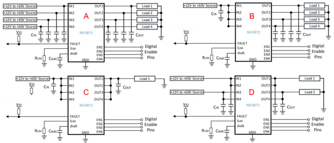 NIV3071由四個集成通道組成,可以獨立驅(qū)動,也可以并聯(lián)在一起,以提供更多負(fù)載電流,如圖3所示。輸入可以由不同的電源或公共電源供電。憑借這種靈活性,NIV3071可以通過同一器件輕松支持48V和12V負(fù)載。這在汽車應(yīng)用中非常有利,因為通過一個器件即可保護ECU(電子控制單元)中的48V和12V負(fù)載。