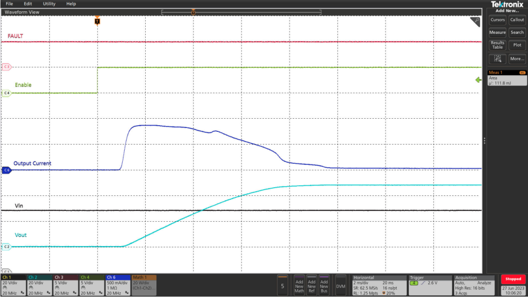 使用上述公式和圖5,用戶可以設(shè)置導(dǎo)通容性負(fù)載時的最大浪涌電流。下面的圖6和圖7提供了一個測試用例:
