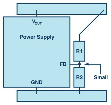 另一個(gè)重要方面是分壓器在電路板布局上的放置。反饋節(jié)點(diǎn)應(yīng)設(shè)計(jì)得盡可能小,以便很少的噪聲可以耦合到該高阻抗節(jié)點(diǎn)。電阻器 R1 和 R2 也應(yīng)非??拷娫?IC 的反饋引腳。 R1 和負(fù)載之間的連接通常不是高阻抗節(jié)點(diǎn),因此可以設(shè)計(jì)為具有更長的走線。圖 2 顯示了靠近反饋節(jié)點(diǎn)放置的電阻器的示例。