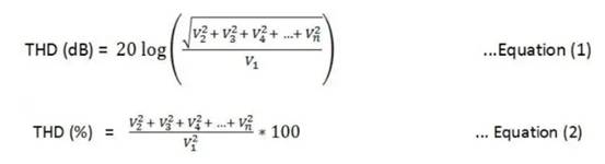 總諧波失真定義為 ADC 輸出中諧波含量相對(duì)于基頻功率的功率。它可以分別按照方程(1)和(2)以分貝或百分比表示 。