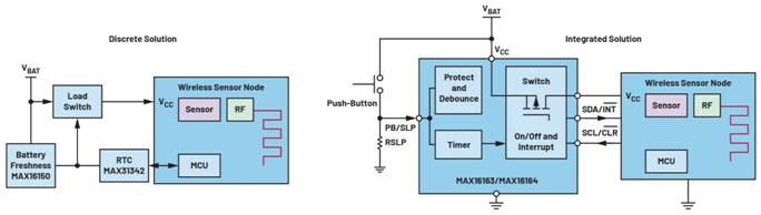 此外,傳統(tǒng)方法通常使用實(shí)時(shí)時(shí)鐘、負(fù)載開關(guān)和按鈕控制器來實(shí)現(xiàn),圖4的集成解決方案將對此加以改進(jìn)。MAX16163/MAX16164集成解決方案不僅能夠?qū)⒔鉀Q方案尺寸縮小60%,而且在保持相同功能的前提下,還能將電池壽命延長20%5。