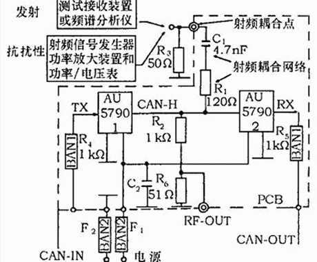 單線CAN通過單根總線連接,一般應(yīng)用于低速場合,典型傳輸速率33 kb/s,最多可連接32個節(jié)點(diǎn)。圖3所示的測試PCB上安裝了兩個單線CAN收發(fā)器AU 5790,電源線BAN2(包含電源濾波電感器)濾波器F1和F2給收發(fā)器提供工作電壓。收發(fā)器1接收經(jīng)BAN1(包含1 kΩ的串聯(lián)電阻)輸入的CAN信息,并經(jīng)CAN-H發(fā)送到收發(fā)器2,收發(fā)器2再將信息經(jīng)BAN1從測試板輸出。測試儀器通過射頻耦合網(wǎng)絡(luò)與CAN-H連接。