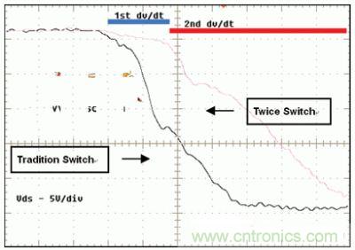 TPS61161升壓轉(zhuǎn)換器除了提供10顆LED的驅(qū)動(dòng)能力外,在EMI問題上也有相應(yīng)的設(shè)計(jì)考慮,其典型應(yīng)用如圖1所示。在TPS61161開關(guān)設(shè)計(jì)上采取兩次開關(guān)過程,有效降低了EMI的輻射強(qiáng)度,從而避免驅(qū)動(dòng)器對手機(jī)其他模塊的影響。如圖2黑色曲線所示,當(dāng)TPS61161打開內(nèi)部MOSFET開關(guān)管時(shí),MOSFET的漏源電壓Vds在很短的時(shí)間內(nèi)從高壓變成接近于零的低壓,即很大的電壓變化率dv/dt;并且在開關(guān)開啟的初期,由于MOSFET的特性,流過MOSFET開關(guān)管的電流變化率也很大,即di/dt??紤]到dv/dt和di/dt對于EMI產(chǎn)生的作用,在MOSFET開啟初期,采用減慢開關(guān)電壓變化率dv/dt來減少EMI強(qiáng)度,如圖2紅色曲線所示。