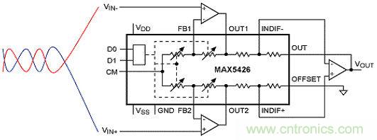 圖7:采用MAX5426高精度電阻網(wǎng)絡(luò)構(gòu)成差分放大器,可靈活設(shè)置放大器參數(shù)