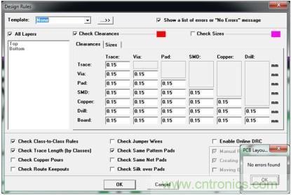 這時(shí)我的疑惑來了。我已經(jīng)將設(shè)計(jì)規(guī)則檢查器設(shè)置為OSHPark公司允許的值,而且我肯定執(zhí)行了設(shè)計(jì)規(guī)則檢查才去生成制造所需的Gerber文件。我怎么會(huì)犯這種錯(cuò)誤呢?我甚至重新檢查了一遍設(shè)計(jì)。我先是檢查了允許的值,然后檢查是否存在任何錯(cuò)誤。我甚至截取了屏幕快照回復(fù)給Dan,說明所有方面我都檢查過了。