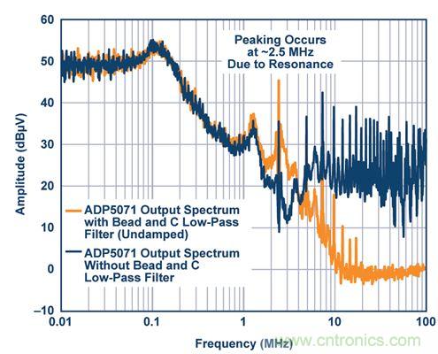 圖9. 采用阻尼方法C時的ADP5071頻譜輸出以及磁珠和電容低通濾波器。