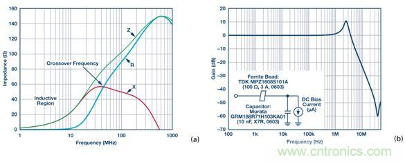 當(dāng)?shù)屯V波器網(wǎng)絡(luò)(由鐵氧體磁珠電感和高Q 去耦電容組成) 的諧振頻率低于磁珠的交越頻率時,發(fā)生尖峰。濾波結(jié)果為欠 阻尼。圖4a 顯示的是TDK MPZ1608S101A 測量阻抗與頻率的 關(guān)系曲線。阻性元件(與干擾能量的耗散有關(guān))在達(dá)到大約20 MHz 到30 MHz 范圍之前影響不大。低于此頻率則鐵氧體磁珠 依然具有極高的Q 值,且用作理想電感。典型鐵氧體磁珠濾波 器的LC 諧振頻率一般位于0.1 MHz 到10 MHz 范圍內(nèi)。對于300 kHz 到5 MHz 范圍內(nèi)的典型開關(guān)頻率,需要更多阻尼來降低濾 波器Q 值。