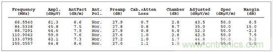 在圖3所示的余量欄中,你可以看到有一個(gè)峰值超出了這個(gè)規(guī)范標(biāo)準(zhǔn)在88.7291MHz處規(guī)定的極限,與規(guī)范相差-2.3。