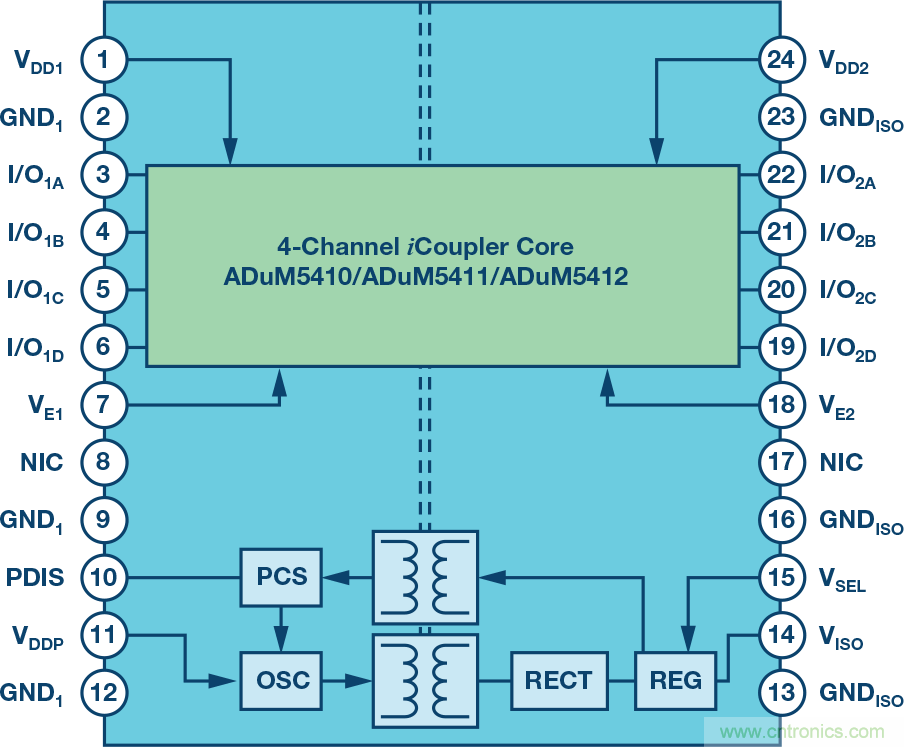 ADI i Coupler®技術和iso Power®技術廣泛用于工業(yè)和汽車市場,這兩種技術可以集成到單個封裝中。以ADuM5411 為例(其功能框圖如圖4 所示),該器件采用7.8 mm × 8.2 mm 24引腳TSSOP封裝,包括完整的電源隔離和四個數(shù)據(jù)隔離通道。其輸出功率高達150 mW,足以滿 足模擬輸入信號調理和數(shù)字化的要求,并能通過2500 V rms UL1577 隔離標準。另外,CMTI(共模瞬變抗擾度)大于75 kV/μs,使其成為存在高瞬變電壓和電流的惡劣工業(yè)環(huán)境(如電廠)的理想選擇。
