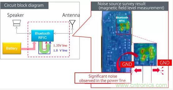圖5顯示了用于測量的測量環(huán)境以及測量與藍牙天線耦合的噪聲的結(jié)果。觀察到極高水平的噪聲,這需要噪聲抑制以降低水平。實現(xiàn)藍牙噪聲抑制時,有兩個關(guān)鍵的實現(xiàn)區(qū)域。