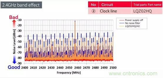 當(dāng)LQZ02HQ濾波器插入時鐘線時,我們有波形和噪聲頻譜。由于LQZ02HQ濾波器具有很少的低頻衰減特性,因此它只能消除2.4 GHz頻段中存在問題的頻譜,同時保持信號質(zhì)量。因此,它是抑制諸如時鐘的信號線中的噪聲的有效方式。
