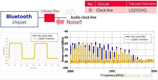 這些是在藍牙通信期間測量與天線耦合的噪聲頻譜的結(jié)果。將BLF02RD過濾器插入電源線。我們能夠?qū)⒄瓗г肼曁岣呒s5 dB,并驗證BLF02RD濾波器是一種有效的解決方案。