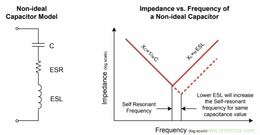圖5實(shí)際電容器模型以及非理想電容器中的阻抗與頻率的關(guān)系 資料來源:Silicon Labs