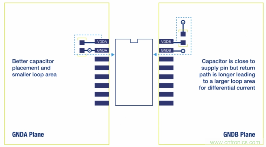 圖7比較了旁路電容器的理想位置和非理想位置 資料來源:Silicon Labs