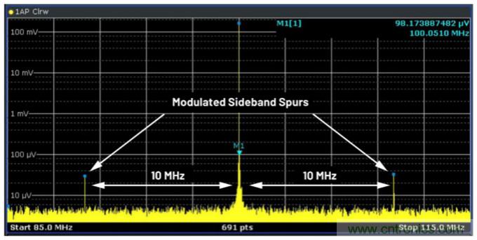 圖7.電源紋波引起的載波信號中的調(diào)制邊帶雜散。