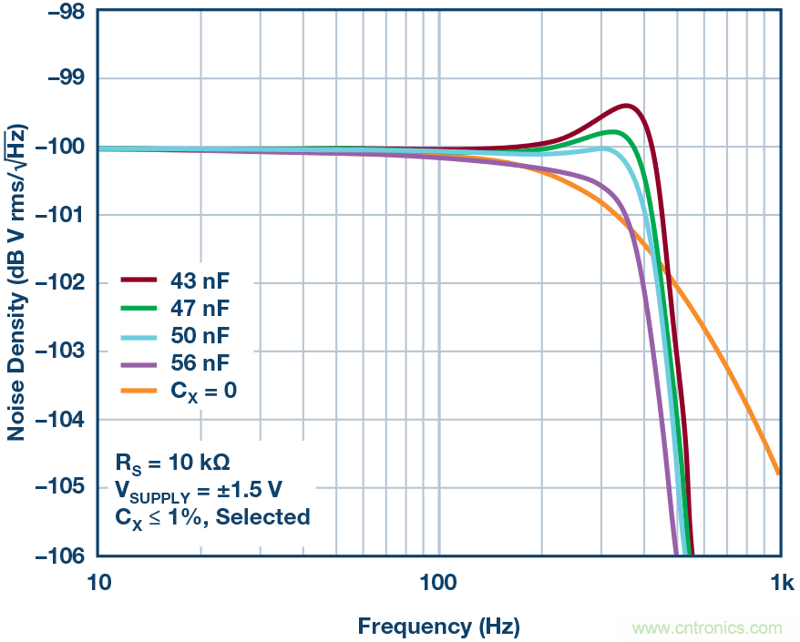 關鍵IC參數(shù)與運算放大器電源電流有關,低電源電流的器件可能需要稍大的CX,而高電源電流的器件很可能需要小于30 nF的電容,同時實現(xiàn)更寬的平坦帶寬。