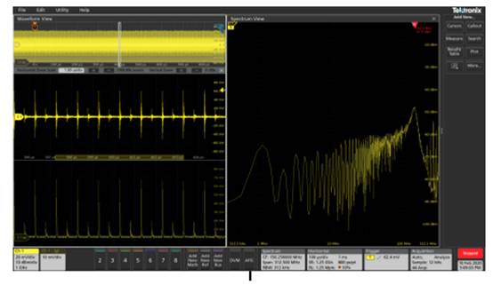 下圖為使用高壓差分探頭、電流探頭和近場探頭測量MOSFET的導通瞬間。在頻譜視圖下可同步觀察導通瞬間的頻譜變化情況。