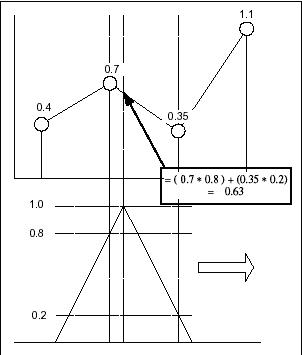 隨著窗口滑到右面,通過把窗口值之和乘以窗口和樣點(diǎn)相交時(shí)的實(shí)際樣點(diǎn)值,得到內(nèi)插點(diǎn)。內(nèi)插的樣點(diǎn)放在窗口頂點(diǎn)時(shí)間上。