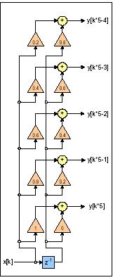通過使用過采樣排列的數(shù)字濾波器,也可以實(shí)現(xiàn)這種卷積。圖中所示的排列是一個(gè)5點(diǎn)過采樣器。在這一排列中,每個(gè)新樣點(diǎn)都生成5個(gè)新樣點(diǎn)。濾波器輸出僅與新輸入和最后一個(gè)輸入有關(guān)。濾波系數(shù)通過對(duì)窗口采樣生成。
