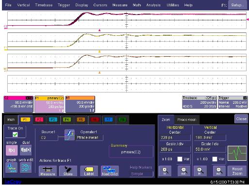 這張圖片說明了在WaveMaster示波器中怎樣測(cè)試SinX內(nèi)插的有效性。在這種情況下,它把重復(fù)的信號(hào)應(yīng)用到通道2,啟動(dòng)余輝,使SinX內(nèi)插失效。F1定義為通道2的余輝曲線中間值。隨著時(shí)間推移,余輝曲線被填充,Ptrace中間值函數(shù)生成輸入模擬波形的清楚圖片。F1保存到存儲(chǔ)器M1中,成為參考曲線。