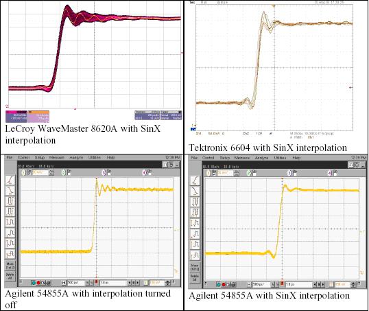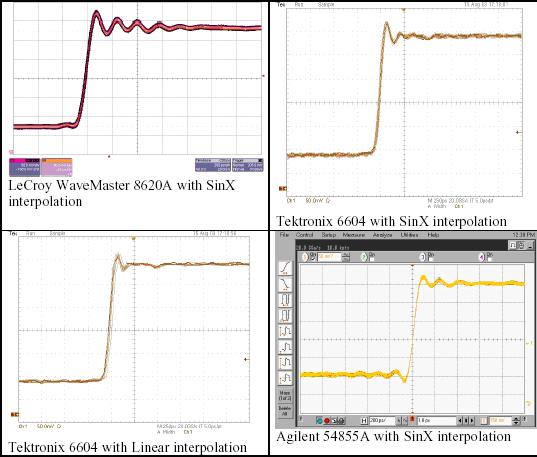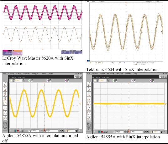 我們使用三種競(jìng)爭(zhēng)的DSO進(jìn)行簡(jiǎn)單的試驗(yàn),其分別是力科Wavemaster 8620A、泰克6604和安捷倫54855A。這三種示波器的帶寬指標(biāo)都是6 GHz,最大采樣率是20 GS/s。我們使用六種不同的信號(hào)和采樣率組合,說明SinX內(nèi)插算法的性能。