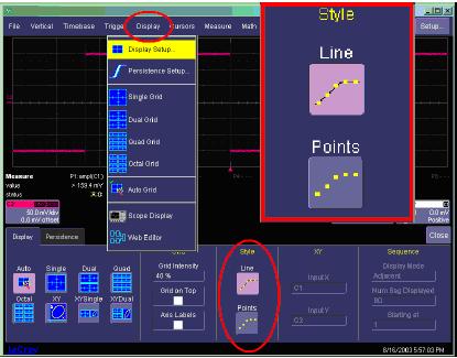 顯示畫面可以設(shè)置成只顯示點(diǎn)或直線。在選擇點(diǎn)時(shí),將只顯示波形點(diǎn),包括任何內(nèi)插的點(diǎn)。在選擇直線時(shí),會(huì)在每個(gè)波形點(diǎn)之間畫一條直線,僅包括顯示畫面上內(nèi)插的點(diǎn)。