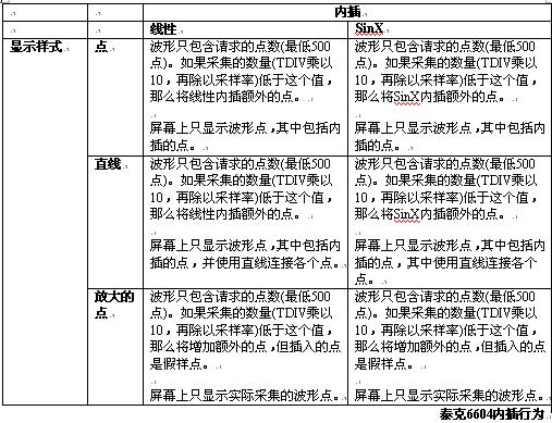 下表詳細(xì)介紹了在WaveMaster上怎樣應(yīng)用內(nèi)插及怎樣顯示波形的規(guī)則。
