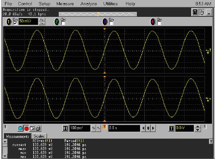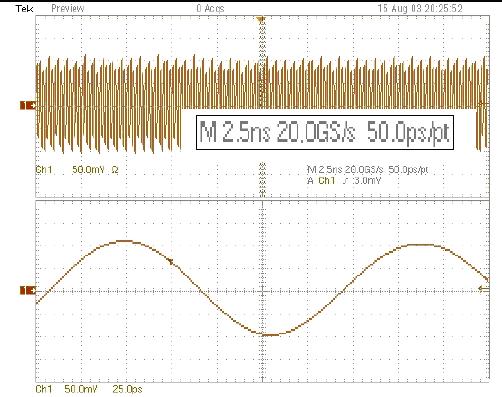 安捷倫示波器,20 GS/s、100 ps/div、啟動(dòng)SinX內(nèi)插。正弦波看上去很好,測(cè)量精度很高。