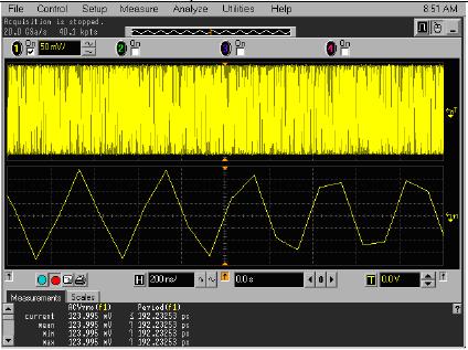 安捷倫允許關(guān)閉或打開SinX內(nèi)插,允許在顯示模式中使用點(diǎn)或直線。與泰克一樣,安捷倫的判斷基于是否內(nèi)插時(shí)基設(shè)置,在低于500 ps/div的時(shí)間/格設(shè)置時(shí)內(nèi)插最多16個(gè)額外的點(diǎn),在高于50 ns/div時(shí)不內(nèi)插額外的點(diǎn)。如果顯示樣式選擇直線,那么將在各點(diǎn)之間劃直線,甚至包括內(nèi)插的點(diǎn)。這與力科實(shí)現(xiàn)方案類似,但這些直線也出現(xiàn)在余輝曲線中,力科從不會(huì)把直線放在余輝曲線中。