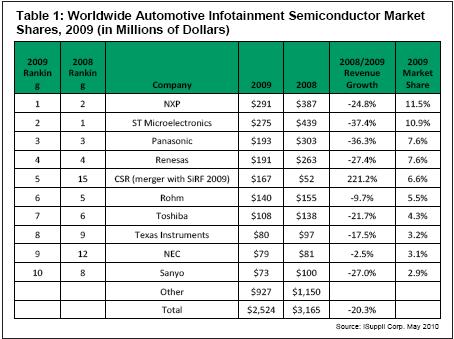 恩智浦半導(dǎo)體(NXP)2009年在全球汽車信息娛樂半導(dǎo)體市場(chǎng)排名第一,這是iSuppli公司從2005年開始追蹤該市場(chǎng)以來的第一次。