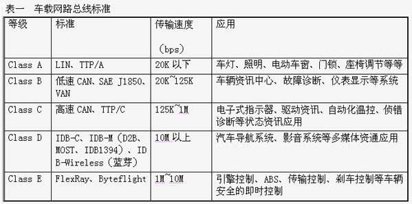 在此趨勢下,已有各種總線技術出現(xiàn)在車載網(wǎng)路(In-Vehicle Network)當中,它們各有其技術特色,適合不同的應用領域。大致上可以分為五類:第一類是傳輸速度最低的LIN、TTP/A,適用于車體控制;第二類包括低速CAN、SAE J1850、VAN(Vehicle Area Network)等中速網(wǎng)路總線,適用于對即時性要求不高的通信應用;第三類包括高速CAN、TTP/C等,適用于高速、即時閉環(huán)控制的多路傳輸網(wǎng);第四類包括IDB-C、IDB-M(D2B、MOST、IDB1394)、IDB-Wireless(藍芽)等,專門用在車載資通娛樂網(wǎng)路之中;第五類則包括 FlexRay和Byteflight,用在最具關鍵性、即時性最高的人身安全系統(tǒng)(請參考表一)。