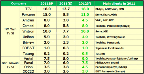 受到品牌需求減少影響,加上部分品牌增加自制比率,臺(tái)灣代工廠第三季呈現(xiàn)5.2%之衰退,但經(jīng)過庫存去化及品牌預(yù)拉升年底銷售業(yè)績(jī)影響,預(yù)估第四季將有6-9%之成長(zhǎng)力道。但整年度看來,TPV(冠捷)還是坐穩(wěn)第一名,明年如能順利掌控PHILIPS品牌,2012年度計(jì)劃有可能朝20百萬臺(tái)邁進(jìn);鴻海(Foxconn)和緯創(chuàng)(Wistron)則受到Sony大幅調(diào)降電視需求影響,今年目標(biāo)恐難以達(dá)成,明年成長(zhǎng)力道也將受到限制;仁寶(Compal)、永碩(Unihan)、景智(Briview)主要客戶群皆以日本品牌Toshiba(主要為歐日訂單)為主,日震和歐洲經(jīng)濟(jì)困頓,也大大影響其年度績(jī)效;瑞軒(Amtran)則受到Vizio波及,整體代工量也未能達(dá)標(biāo)。盡管臺(tái)灣電視代工廠有Philips、Sony、Toshiba及Vizio等國(guó)際品牌及自有品牌的加持,但還是逃不過大環(huán)境不佳的沖擊。