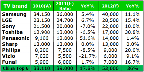 而今年Sharp以日本市場(chǎng)為主軸;Toshiba以日、歐為主要銷售地區(qū),年成長(zhǎng)表現(xiàn)衰退;Sony銷售地區(qū)橫跨歐、美、日,除了區(qū)域性需求不振,加上其組織策略反映較緩慢,不僅財(cái)報(bào)未見起色,年度液晶電視出貨目標(biāo)更呈現(xiàn)7%之衰退,下修至20百萬臺(tái);Panasonic因購買Sanyo品牌,看似整體市占率提升,但內(nèi)部獲利壓力頗大,除打算出售位于日本茂原的六代廠,亦將減少8.5代廠的產(chǎn)能,后續(xù)仍須觀察;Philips以歐洲為主要市場(chǎng),難幸免于歐債風(fēng)暴沖擊;Vizio面臨與LGD之合作關(guān)系生變,加上北美市場(chǎng)不景氣,年度銷售量下滑幅度甚鉅;反觀大陸品牌挾帶雄厚資源,年度銷售量成長(zhǎng)依舊維持在17~18%左右,市占率更達(dá)19~20%,2012更預(yù)估有3成之成長(zhǎng)力道。