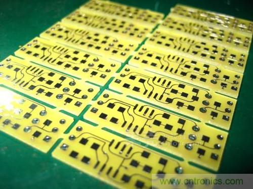 雙面裸板,沒有做阻焊,只做了過孔。銅箔實(shí)際上是鍍錫的,銀色閃亮的,因?yàn)榕臄z的緣故變身包公了。因?yàn)槎际琴N片,焊接起來比較費(fèi)眼神,當(dāng)然對(duì)于熟練工是我來說還是完全沒問題的。速度焊接起來。