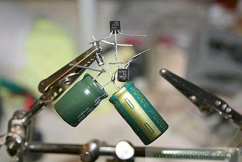 首先把大部分電子器件焊接到一起,最簡單的順序是從電容開始,把它們的負極引腳焊接在一起,然后把二極管的正極和3300uF電容相連,負極連接到1000uF電容的正極。