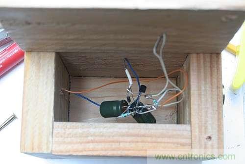 打開之前做好的木制支座盒子,把焊接好的電路放進去,將太陽能電池板的引線穿過盒子上的安裝孔,焊接到電池板上。用同樣的方法連接好線圈,線圈外圈的引出線連接到電路的地線上,線圈中心的引出線連接到3906晶體管的右側引腳上。最后把LED穿入你設計好的安裝孔。