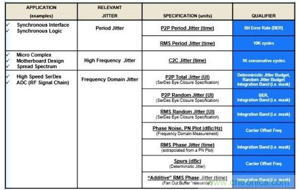 設計師要考慮的第一個也是最根本的檢查點是確定針對特定應用最相關的時鐘抖動類型。表1總結(jié)了根據(jù)應用類型的一些抖動分類,以及相應的規(guī)格指標限定。