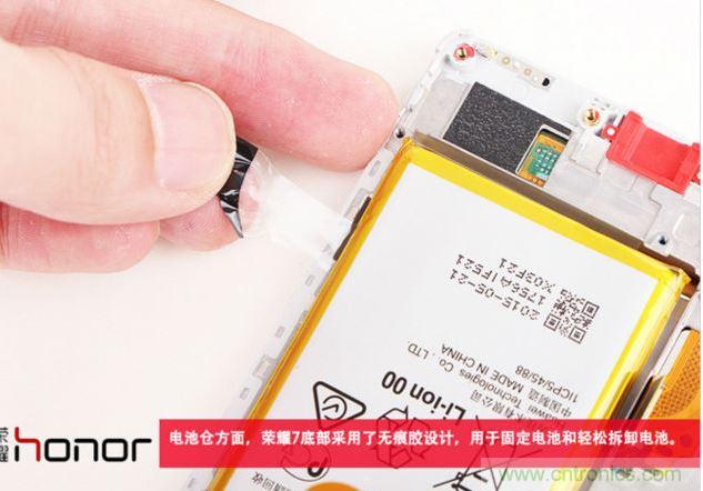 電池倉,榮耀7底部采用無痕膠設(shè)計(jì),用于固定和輕松拆卸電池。