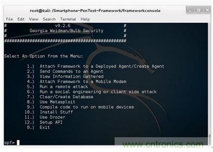 其次,我們需要下載并安裝智能手機(jī)Pentest框架。該框架由Georgia Weidman一手打造,而美國(guó)國(guó)防部是其最大的金主。在當(dāng)今業(yè)界,Pentest框架絕對(duì)稱得上是智能手機(jī)的開發(fā)利器。