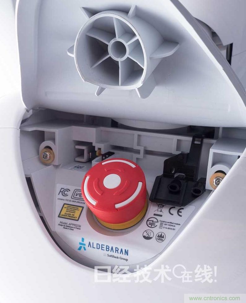 連接上半身和下半身的,是疑似為信號線的扁平電纜,以及估計是用來供電的4條粗電纜。Pepper是電池驅(qū)動的產(chǎn)品,只要打開了胸前的電源開關(guān),就會一直保持通電狀態(tài)。