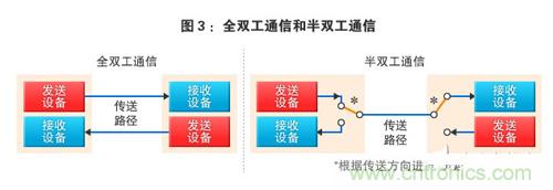 在異步通信中,能實現(xiàn)按“單片機→外圍設(shè)備”或“外圍設(shè)備→單片機”的方向確保數(shù)據(jù)信號專用的信號線時,被稱為全雙工通信。另一方面,將通過1根信號線來切換通信方向的方式稱為半雙工通信。全雙工方式時需要2根信號線,可同時進行發(fā)送和接收。半雙工方式時僅需1根信號線,但必須在發(fā)送和接收之間進行切換(圖3)。